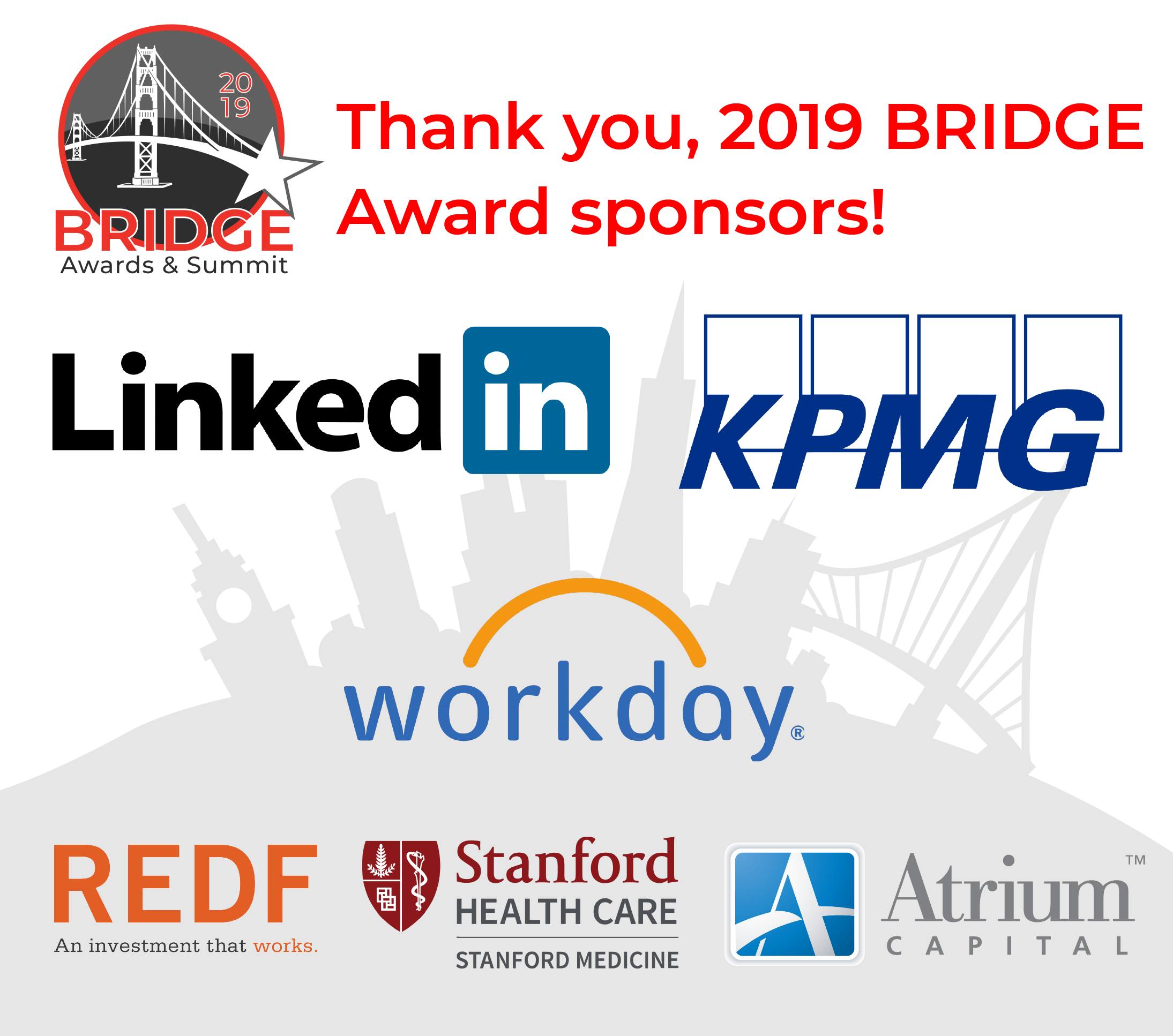 Congratulations to the 2019 BRIDGE Award winners: Checkr, Clif Bar, San Francisco International Airport, Starbucks & Yerba Buena Engineering & Construction!