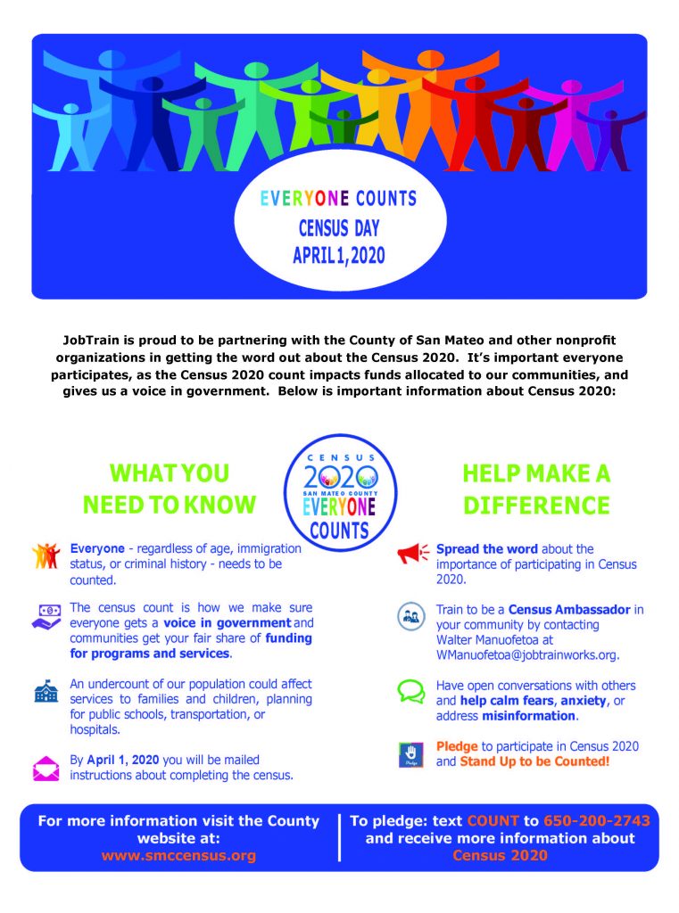 Every 10 years, the federal government is required to count all residents in the United States, citizens and noncitizens alike, through a national census. The next national census is in April 2020. The information is used to make sure everyone is equally represented in our political system and that government resources and funding are allocated fairly. It is also used to make important decisions about community programs and services, like where to build homes and parks, establish public transit routes, build new roads and offer language access services. Make sure you participate on April 1st. For more information see below and visit: https://cmo.smcgov.org/census-2020-san-mateo-county