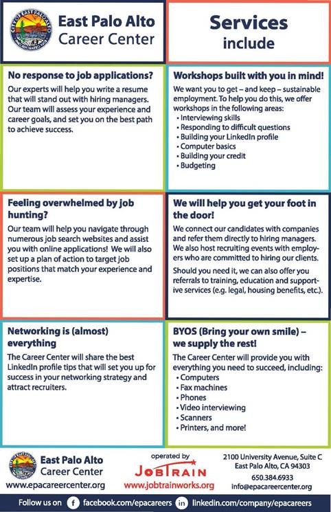 In response to requests made by East Palo Alto community members and our clients, beginning Monday, April 8, 2019, the East Palo Alto Career Center‘s hours of operation will be: