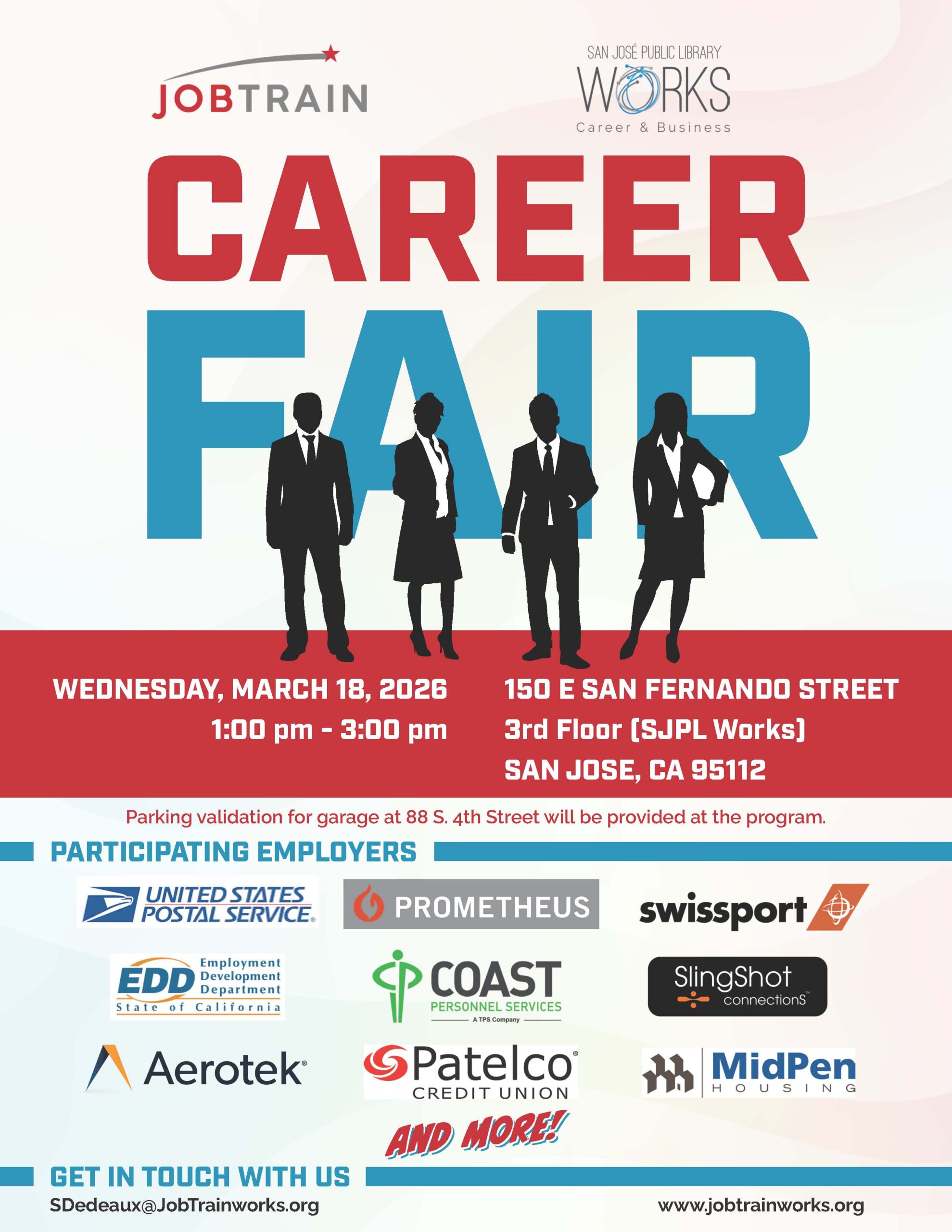 March 18, 2026 – Career Fair – San Jose Date: Wednesday, March 18, 2026 Time: 1 pm – 3 pm PT Location: SJPL Works 150 E San Fernando St, 3rd Floor, San Jose, CA 95112 Multiple organizations will be onsite and ready to meet with you Bring your resume Parking validation available for garage at 88 S. 4th Street View flyer Need help with your resume before the job fair? Schedule an appointment with an Employment Specialist near you today Mary Doniego2026-03-04T15:52:57-08:00 Share This Page, Choose Your Platform! FacebookXRedditLinkedInWhatsAppTumblrPinterestVkEmail