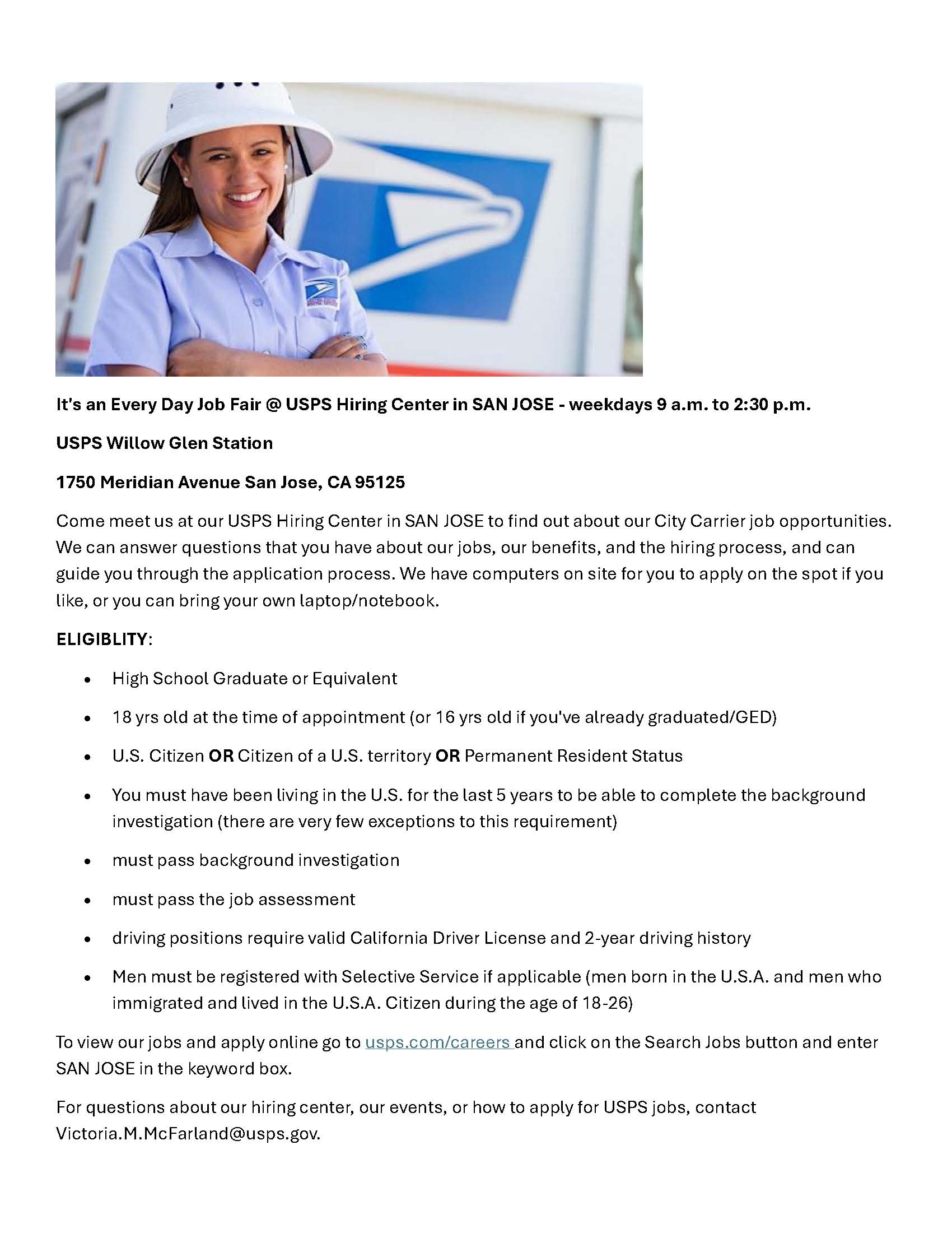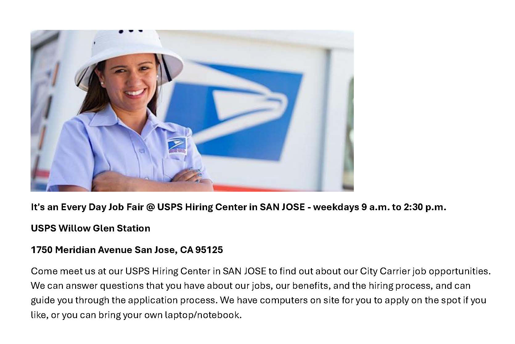 • Come meet us at our USPS Hiring Center in San Jose to find out about our City Carrier job opportunities